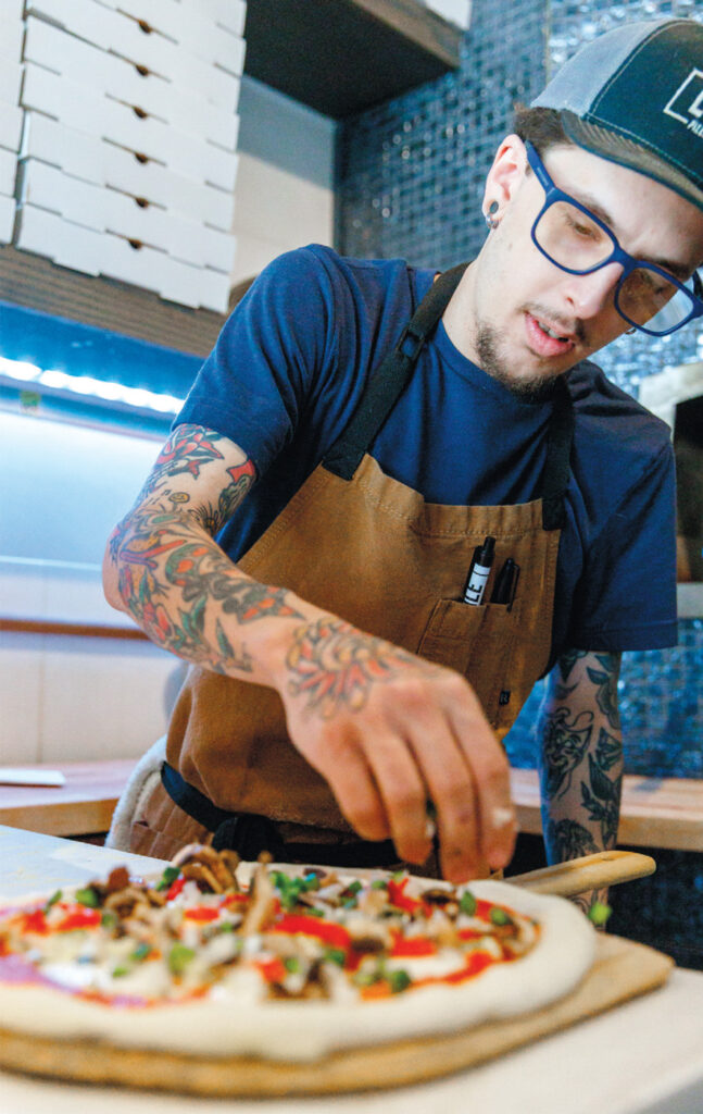 “You can get any meat pizza here that you can get at any other restaurant. But we wanted to focus on a healthier style … we use good oils, healthier ingredients,” Boeve says. And that focus on healthy ingredients is evident throughout the menu. “I get sunflower protein, and we make sausage out of it. We make our own thing called ‘vegan fat,’ which we can sprinkle on pizzas to give that kind of greasy feeling that people want, that kind of drips down. And our vegan sausage, well, it tastes like sausage. It’s a bit different, but if you’re vegan, you’ll appreciate it,” Boeve says.