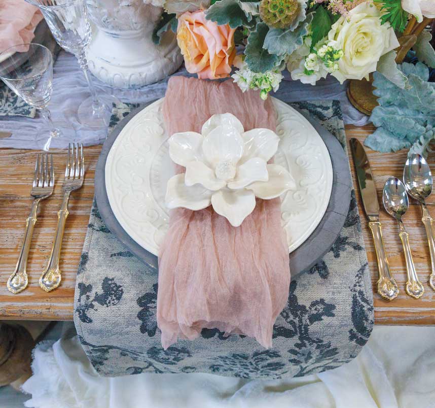 Photo 2: Wood charger $24 ea, Gauze runner/napkins $40.